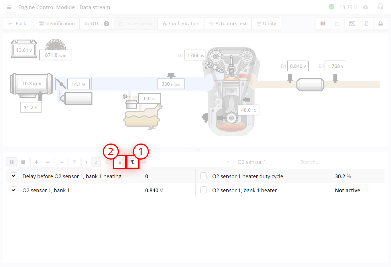 On the "data stream" tab, you can filter only the parameters you need by creating your own set of filters. Filter sets are needed to quickly display the parameters you have chosen in advance.