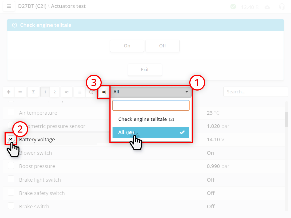 Many control units allow you to temporarily control actuators (injectors, motors, solenoid valves) to check their performance.